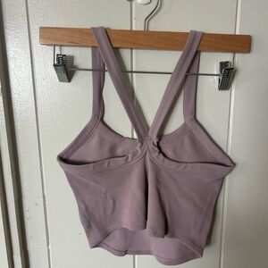 Ribbed cropped tank in a soft lavender shade. Double shoulder straps and a V-back seam. Stretchy knit for easy layering. Casual, minimal silhouette.