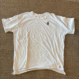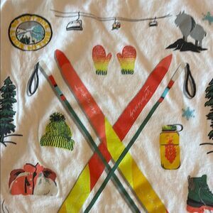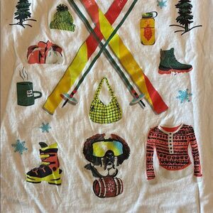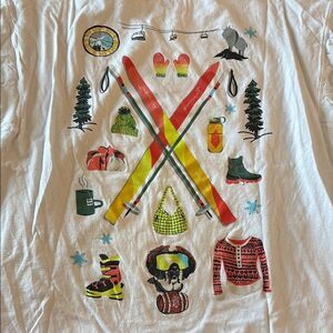 White short sleeve tee with colorful graphic design. Features outdoor-themed illustrations.