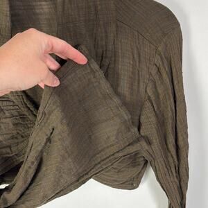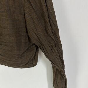 Gently Used Free People FP One Cropped Long Sleeve Top. This is a women's small. Green / brown color throughout. Collar. Lightweight and breezy. 67% cotton, 33% viscose.