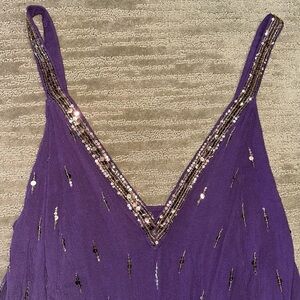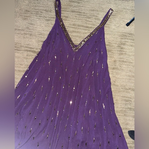 NWOT Free People Intimately slip dress with sequins and beads. Strapped and covered in sequins. V neck, low back, unlined. Jade purple and 100% rayon, no stretch. Fits more like a medium in my opinion. Offers welcome!