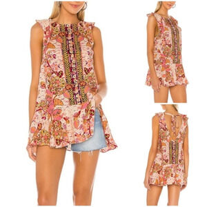 Its all about the frills in this floral-print Free People tunic top, featuring flounce ruffle at the cap-sleeves and hem. Approx. model measurements: height: 5'10"; bust: 32"; waist: 25"; hips: 35" and she is wearing a size extra small. Hits at hip Crewneck; tie closure at back neck Flounce sleeves and peplum hem ABOUT THE BRAND: If you love the laid-back charm of boho-chic apparel, you'll find a beautiful selection of clothing from Free People Linen/rayon Machine washable