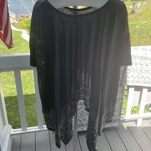 FP mushroom brown tee. Short sleeves. Runs longer in sides and shorter in back Has beige print on it. I have in red also that’s listed in here