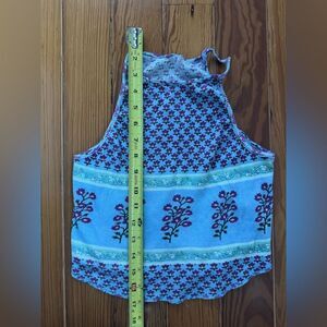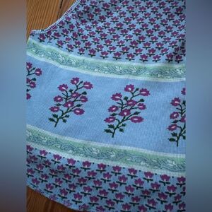 Lightly worn. Blue in color. Mixed print. Purple floral print. Size L