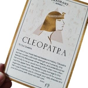 Fragrant Jewels Cleopatra Candle and Bath Bomb Set. Both the candle and bath bomb release warm, spicy aromas inspired by ingredients used in Egypt during Cleopatra’s rule: anise, Manuka honey, cinnamon spice, sweet wine, and patchouli.