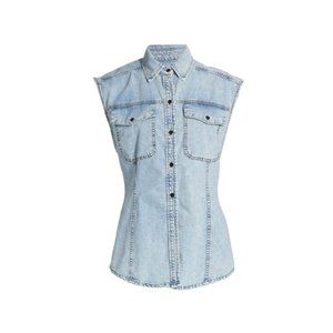 This sleeveless denim top features utilitarian chest flap pockets and a sleek slim fit. Spread collar Sleeveless Button-front closure Chest flap pockets 100% cotton