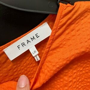 Bright and bold! This FRAME sleeveless midi dress features a lightweight seersucker fabric in a vibrant orange hue. Designed with an asymmetric tiered skirt for a flattering flowy silhouette. Perfect for warm-weather outings, vacations, or making a statement at brunch.