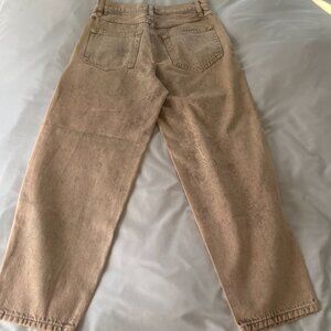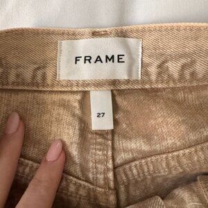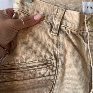 FRAME Barrel Leg High Rise Denim Jeans sz 27. Very cool color somewhere between off white cream and stone washed muted peach. Multiple cargo hip pockets, back pockets, and cropped length. Laid flat measures approx. 13" waist, 11.5" rise, 25" inseam. Please note these were purchased new from a FRAME NYC sample sale and does not include a style tag - may have been from a limited edition/test design run. Excellent condition.