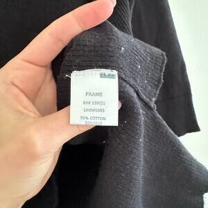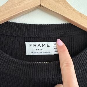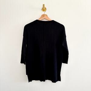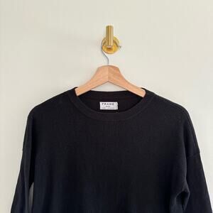 Details: Frame Ribbed Knit 3/4 Sleeve Crew Neck High Low Hem Sweater- Size: XS- Color: Black- Material: 70% Cotton, 20% Silk, 10% Cashmere- Features: Ribbed knit, pullover, 3/4 sleeve, crew neck, stretch, high low hem, comfort, breathable, casual.
