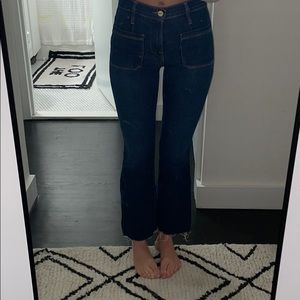FRAME crop boot 70s style denim. Great condition! Small pockets in front and back, very flattering. Dark blue denim with tan stitching. Size 23.