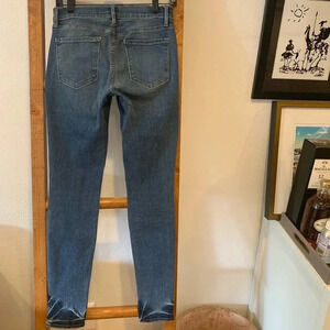 Worn only one time! Super stretchy, very comfy skinny jeans from Frame. Distressing at the knees and dye detailing at the ankles.