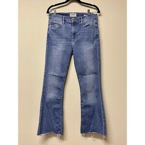 Frame Denim Le High Flare in Chatwin wash. Slightly lighter than medium blue. Excellent pre-owned condition EXCEPT the bottoms have been cut and now have a raw hem. Please check measurements below.