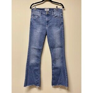 Frame Denim Le High Flare in Chatwin wash. Slightly lighter than medium blue. Excellent pre-owned condition EXCEPT the bottoms have been cut and now have a raw hem. Please check measurements below.