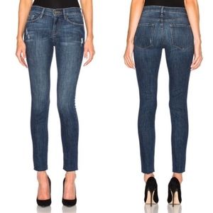 FRAME DENIM Le Skinny de Jeanne Jeans in Grand Street Wash, Medium Blue Distressed Rinse, Raw Hem, Skinny Stretch High Rise Jeans, Ankle Length, Size 24