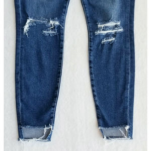 Frayed and distressed details throughout with a high-low hem at ankle and stretch too!
