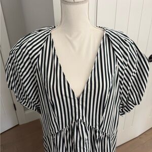 FRAME, dress, tiered, v neck, dress bells out, colors are white and navy, puffy short sleeves, hardly worn, excellent condition, no blemishes or flaws.