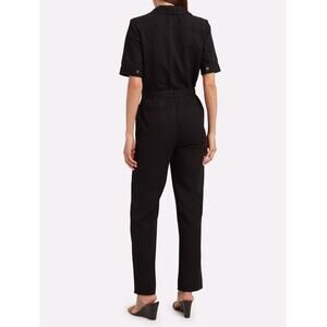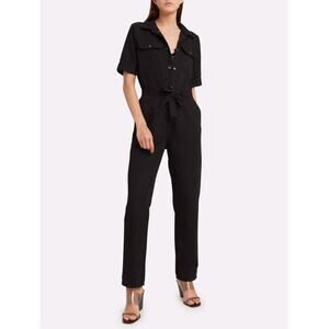 FRAME's black jumpsuit in a summer cotton and linen blend is a utilitarian-inspired style with a belted waist. Pointed collar. Chest pockets, slip pockets at the waist. Silver-tone hardware. Loose through the leg, relaxed fit.