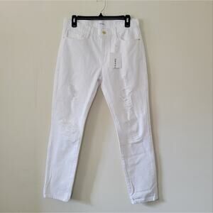 A tailored boyfriend jean with a high-rise waist and straight legs that taper just slightly above the ankle. In a bright white wash and comfort stretch denim. Slimmed down for a tailored fit, these white jeans feature heavy distressing to perfect that laid-back, had-'em-forever look. INTENDED TO BE WORN OVERSIZED. SIZE DOWN IF YOU PREFER A MORE FITTED LOOK. 5-pocket styling. Button/zip fly closure. 88% Cotton 8% Reused Cotton 4% Recycled Polyester Style: LGJ171 SIZE: 30 COLOR: RUMPLED BLANC RIPS - DISTRESSED
