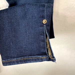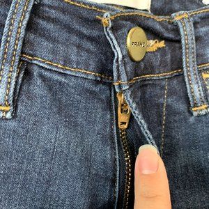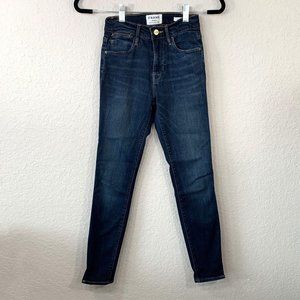 FRAME Denim Le High Skinny Slit Hem Skinny Jeans In Wythe. Dark wash skinny jeans with slit bottom hems, light distressing and 5 pocket construction. Zip fly. Stretchy denim 44.5% cotton/47% modal/6% polyester/2.5% elastane. *AI cover photo