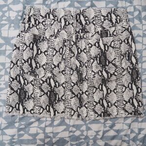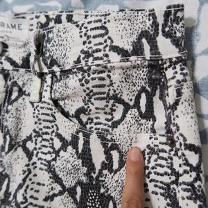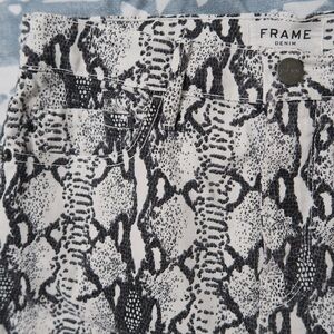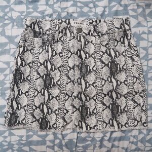 Notch-front denim skirt by Frame modernized with a tonal python-print, five-pocket style, zip fly with button closure, notch front, distressed hem, a-line silhouette. Great preloved condition, one tiny discoloration mark by the front pocket. Please see pictures.
