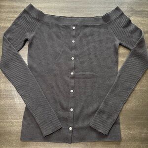 Elevate your knitwear game with this FRAME off-shoulder ribbed sweater in luxe medium noir. Designed with a flattering, fitted silhouette and ultra-soft wool blend, this top hugs the body without sacrificing comfort. The off-shoulder neckline and decorative button-down front add stylish detail, making this more than your average basic.