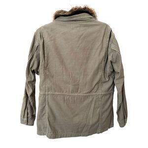 Military green jacket with removable faux fur lining. Multiple large flap pockets. Zip and snap closure. Top layer: 100% cotton, faux fur lining: acrylic, modacrylic blend. Great preloved condition - no flaws. Size small