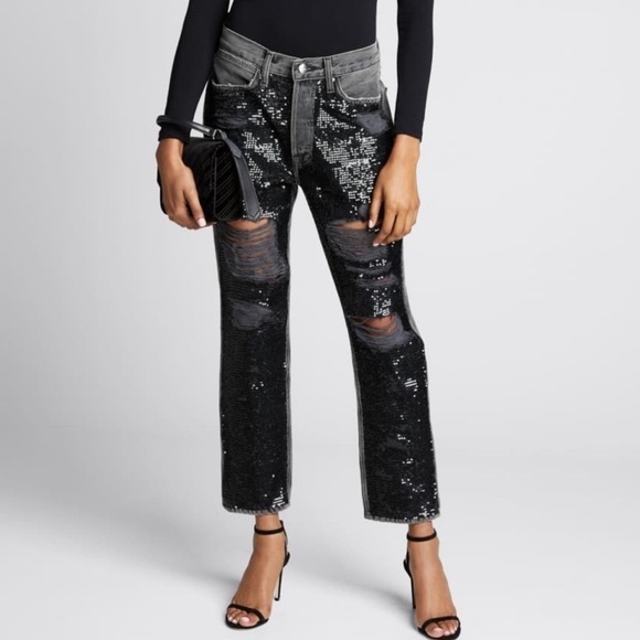 FRAME Gray Denim Sequin Basque Rip Distressed High Rise Button Fly Straight Ankle Length Jeans