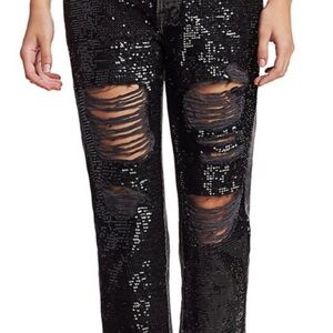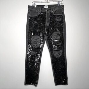 Make a statement! Be there and be seen in these edgy glamour gray wash black sequin jeans. Rips and distressing with a black layer of shimmering sequin front.