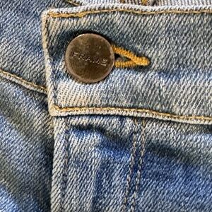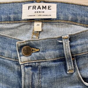 These FRAME Jeans in size 29 for women are a stylish and versatile choice featuring a classic mid-rise slim fit in a timeless blue denim. Made in Los Angeles, these jeans are crafted from a comfortable cotton blend fabric with a light medium wash, making them suitable for all seasons. The 5-pocket design and easy-care features add practicality to the chic design, while the breathable material ensures comfort throughout the day. Button and zipper closure adds a touch of sophistication to this wardrobe staple, perfect for a preppy and trendy look.