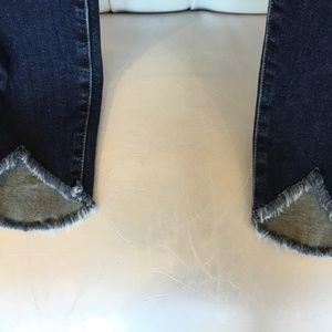 high waist skinny leg, raw angled hem, distressed hole right knee, whiskered