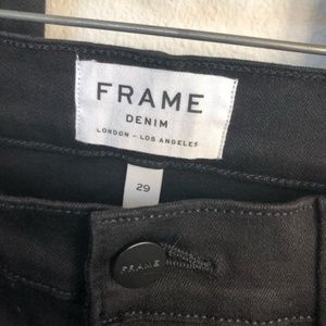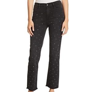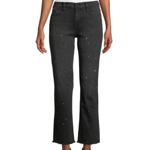 FRAME jeans in stretch-denim with crystalized studs. Approx. measurements: 10" rise; 27.5" inseam; 14" leg opening. High-rise; belt loops. Button/zip fly. Five-pocket style. Slim fit; straight legs. Cropped at ankles. Raw-edge hem. Cotton/modal/polyester/spandex. Made in USA of imported materials.