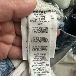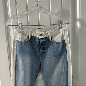 FRAME Le Crop Mini Boot Jeans Sz 26 Great Condition. No rips, stains or issues other than intended style. STYLE: LCMBIBR439/OLIN - Mini Bootcut - Ankle/ Cropped Length - Color Block/ White-Blue - 5-pocket styling - Zip Fly/ Button Closure - Frayed Raw Hem - Subtle distressing at Rims of Pockets ** see pics for approximate measurements ** W051524X00
