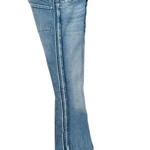 This chic cropped style features a flattering slim fit through the thigh with a subtle kick flare at the knee. The distressed tuxedo stripe detailing along the sides adds a bold twist to your everyday denim look. Perfect for dressing up or down!