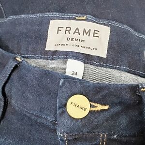 Cropped, capri length and shredded hems lend modern edge to the '70s-inspired silhouette of these subtly flared jeans woven from premium denim in LA. Zip fly with button closure - Five-pocket style. Andover Road dark wash. Nice stretch.