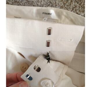 Elevate your wardrobe with these FRAME Le Crop Palazzo Pants in Bone, Size 4. Featuring a chic wide-leg silhouette and cropped length, they offer a stylish, high-rise fit. A small flaw on the front has been creatively concealed with a decorative button detail—subtle and stylish, though not factory-applied. These pants are in excellent condition otherwise. Perfect for adding effortless polish to casual or dressy looks.