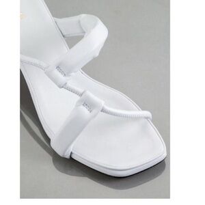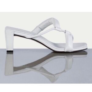 Super cute slip on block heel kitty heel white slides. Perfect to pair with your favorite summer dress, shorts or jeans