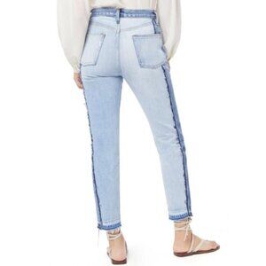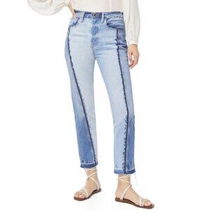 Contrasting denim panels and frayed trim give a boho-inspired vibe to these flattering high-waisted jeans.