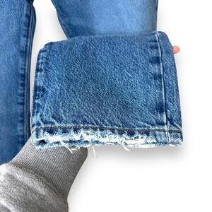FRAME Le Original Distressed High Waisted Button Fly Straight Leg Denim Jeans.