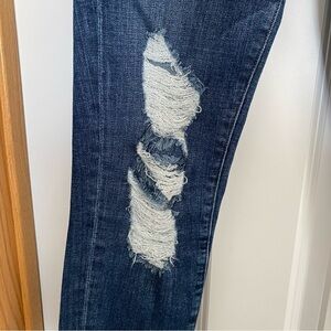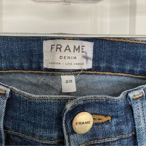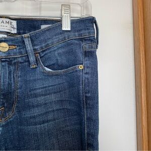 EUC pair of Le Skinny de Jeanne jeans from FRAME in a size 28. These jeans have some distressing around the thigh and knee area and are a nice medium to dark wash. 100% cotton. Mid rise. No stains or flaws!