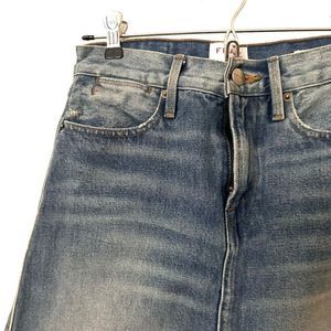 Medium wash/intentionally faded denim skirt. Raw hem. High waist. From the Re-Release Rigid collection. "The Roxy" color. 100% cotton - Great preloved condition, no flaws! Size 24