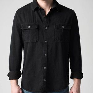 FRAME Men's Vintage Army Shirt in Faded Noir. Versatile long sleeve button down shirt. Casual fit and styling. Pointed collar, long sleeves, single barrel mitered cuffs, front placket, chest patch pockets with flap, and curved shirttail. 59% Cotton / 30% Tencel / 11% Rayon. Fits true to size, approximately 30" in length (size M). Brand new, with tags.