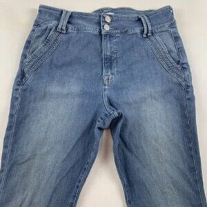 Great used condition, cotton stretch blend blue jeans have minor signs of use to back hems but no legitimate defects that take away from the overall aesthetic or functionality. 4 pockets, zip front, double button closure, belt loops, high rise, very stretchy denim. Size 32, please reference measurements for sizing & fit inquiries.