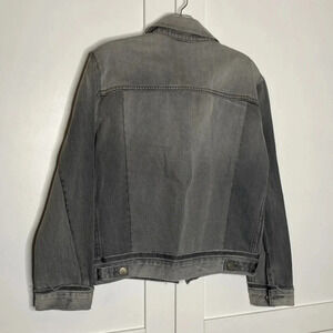 Mix of denim washes, dyed panel features on the hem and cuffs, 2 patch pockets and 2 welt pockets. Fold-over collar and buttoned placket. Long sleeves. Size XS.