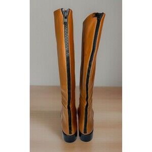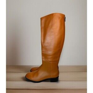 Elevate your style with these FRAME Ramsey knee-high riding boots. Crafted from high-quality tan leather, these boots feature a closed toe and a zip closure for a secure fit. The boots have a low block heel, making them comfortable for all-day wear. They come with a solid pattern and are perfect for travel, party, casual, and work occasions.