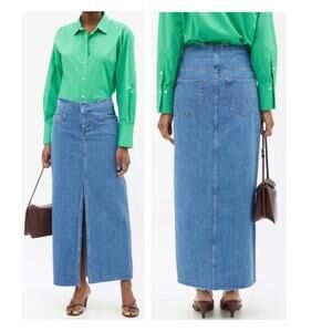 FRAME denim maxi skirt with a cut-off waist and a center slit A-line silhouette Five-pocket style Full length Zip fly with hook and bar closure. Unlined. 100% cotton
