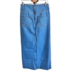 Non-stretch denim long skirt in blue, High-rise, Four-pocket styling, · Raw edge at waistband, · Vent at front hem