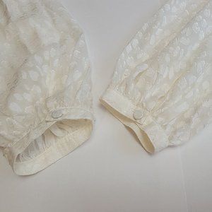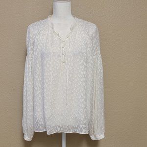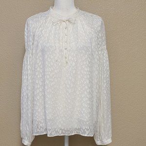 Snowy jacquard spots fall across this billowy blouse designed with dropped shoulders and a gathered tie neckline for bohemian-inspired ease. You can pair it with skirts, trousers, or jeans. Your call.