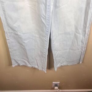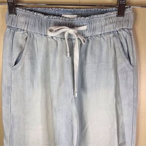 FRAME Super Drape Wide Leg Denim Drawstring Women's Chambray Pants Size Small. These FRAME Denim pants are designed for women and feature a relaxed, wide-leg style in a solid blue chambray material. They include an elastic waistband with a drawstring closure, functional side pockets, faux back pockets, and a frayed hem.