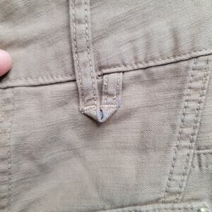 Tan color utility pants with large patch pockets and a double-button detail. Size 26, pre-owned in good used condition with minor signs of wear. Left belt loops show faint rubbing staining but not too noticeable when worn. Also one of the snap buttons ( waist) have come undone, it is still attached to the other part but undone from the fabric.