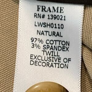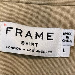 FRAME Tan Double Breast Trench Style Jacket Size Large with notched collar and cuffs and pockets. Every closet needs a jacket like this! Perfect for year round wear. Elevate your style game - it's a versatile go-to for any look!