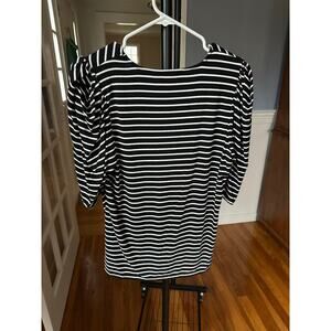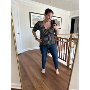 I love this super pretty, stretchy FRAME V-Neck Shirt in Size Large! Easy to wear with a super cute design, black/white monochrome design that works for business OR casual depending on what you wear it with. Slightly puffed sleeve and flattering fit!